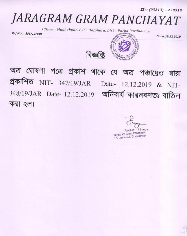 পঞ্চায়েত প্রধানের বিরুদ্ধে গত ১৯ ডিসেম্বর বিডিওর কাছে লিখিত অভিযোগ দায়ের করেন উপপ্রধান সুভাষচন্দ্র কোলে সহ চারজন নির্বাচিত সদস্য।সেখ আলাউদ্দিন ,নুরজাহান বিবি, কবিতা ঘোষ , মিতালি সাধুখাঁ প্রমুখ সদস্যরা পঞ্চায়েতের বিভিন্ন উন্নয়ন কাজের বিভাগের সঞ্চালক । লিখিত অভিযোগে তাঁরা বিডিওকে জানান ,“ সরকারী প্রকল্পের একাধীক কাজের (NIT-347/19/JAR ও 348/19/JAR) টেন্ডার কারানোর আগে প্রধান পূর্ত ও অর্থ কমিটির কোন মিটিং করাননি । সরকারী নিয়ম মেনে ওপেন টেন্ডার করার কথা বলা থাকলেও তা মানা হয়নি। নিজের স্বার্থ পুরনের জন্য সবাইকে অন্ধকারে রেখে প্রধান নিজের ইচ্ছামতো একতরফা ভাবে টেন্ডার প্রক্রিয়া সম্পন্ন করিয়েছেন বলে উপ প্রধান ও চার সদস্য অভিযোগ করেন ।এই অভিযোগ পাবার পর ওইদিনই প্রধানকে চিঠি পাঠিয়ে বিডিও টেন্ডার প্রক্রিয়া সংক্রান্ত ব্যাক্ষা চান ।