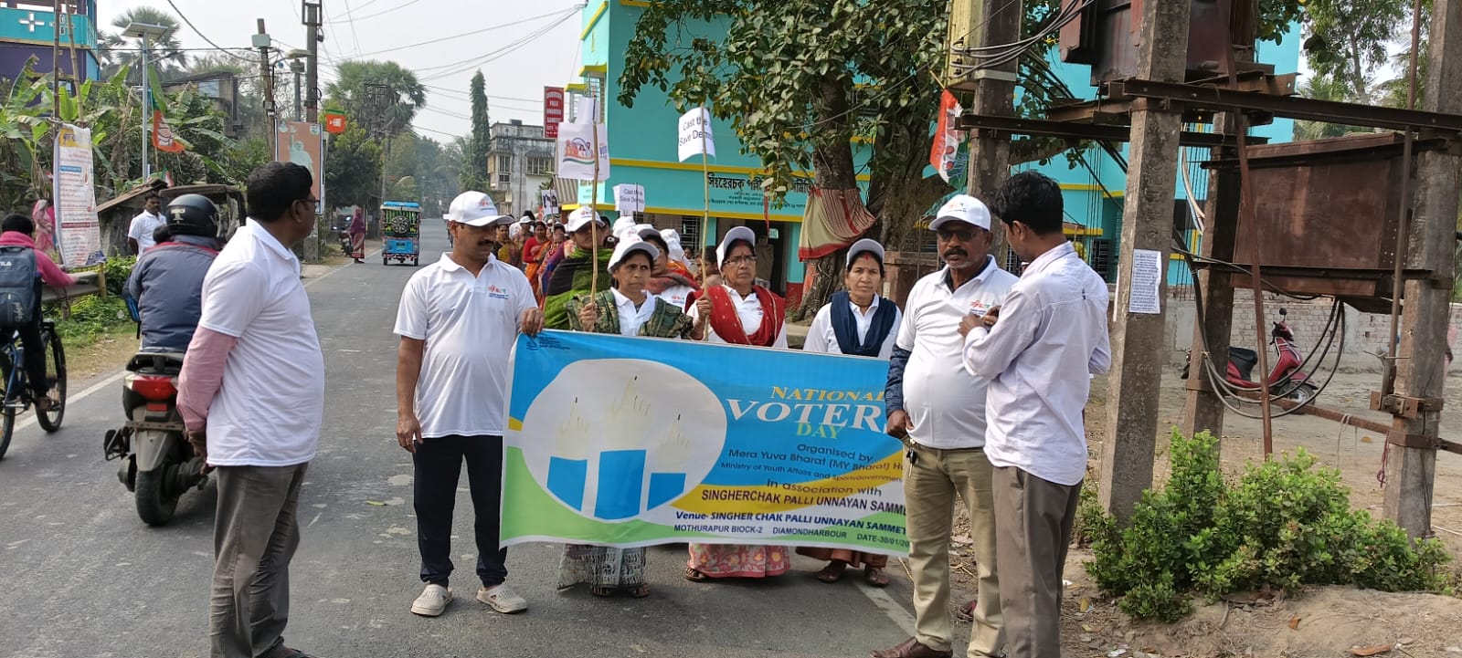 উজ্জ্বল বন্দ্যোপাধ্যায়, মথুরাপুর: ডায়মন্ড হারবার” মাই ভারতে” এর সহযোগিতায় মথুরাপুর ২ নং নম্বর ব্লকের সিংহের চক পল্লী উন্নয়ন সমিতির উদ্যোগে শুক্রবার জাতীয় ভোটার দিবসকে সামনে রেখে একটি অনুষ্ঠান অনুষ্ঠিত হলো।এদিনের অনুষ্ঠানে উপস্থিত ছিল প্রায় দুইশত মানুষজন।এদিন সকাল ৯ টায় সমিতির প্রাঙ্গণ থেকে কাশীনগর হয়ে কৌতলা পর্যন্ত শোভাযাত্রা সংগঠিত হয় ।
