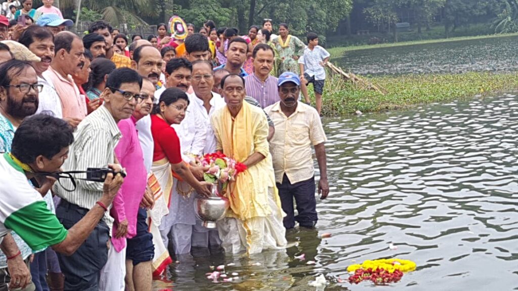 এদিন সকালে পূজার্চনার পর মন্দির থেকে মায়ের রূপোর ঘট নিয়ে শোভাযাত্রা বের হয়। ঢাক সহ বিভিন্ন বাজনা নিয়ে ঘোড়ায় টানা রথের ওপর বিশেষ ছাতার তলায় ঘট নিয়ে বসেন পুরোহিতরা। বেশ খানিকটা পথ পরিক্রমা করে শোভাযাত্রা যায় কৃষ্ণসায়রে। সেখানে মন্ত্রোচ্চারণের মধ্য দিয়ে মন্দিরের প্রধান পুরোহিত ঘট জলপূর্ণ করেন। এরপর তা নিয়ে এসে মন্দির প্রতিষ্ঠা করা হয়।অনুষ্ঠানে ছিলেন প্রশাসনের আধিকারিকরা।
